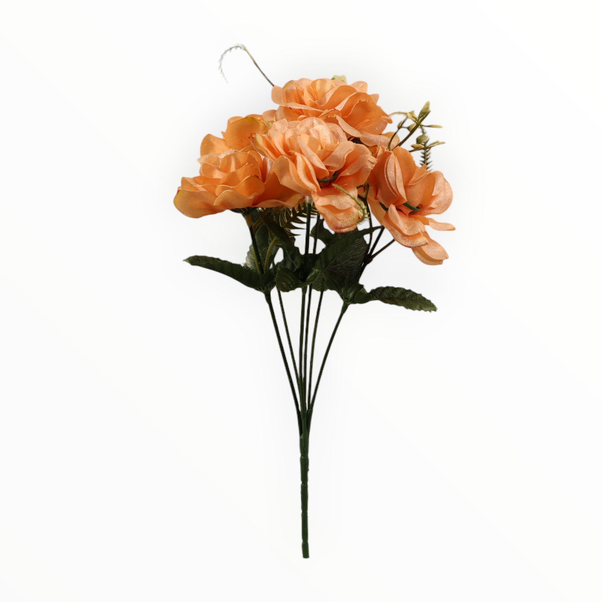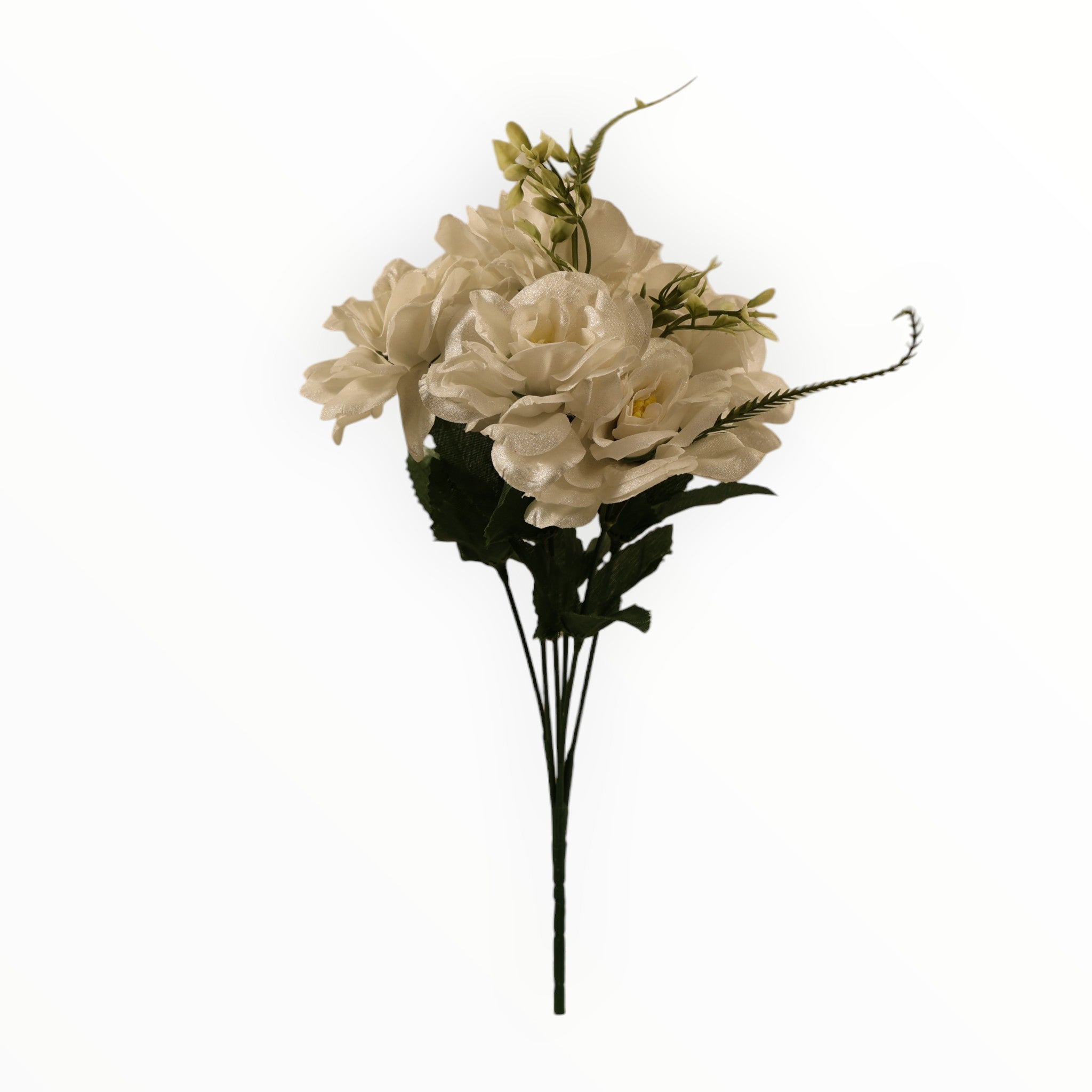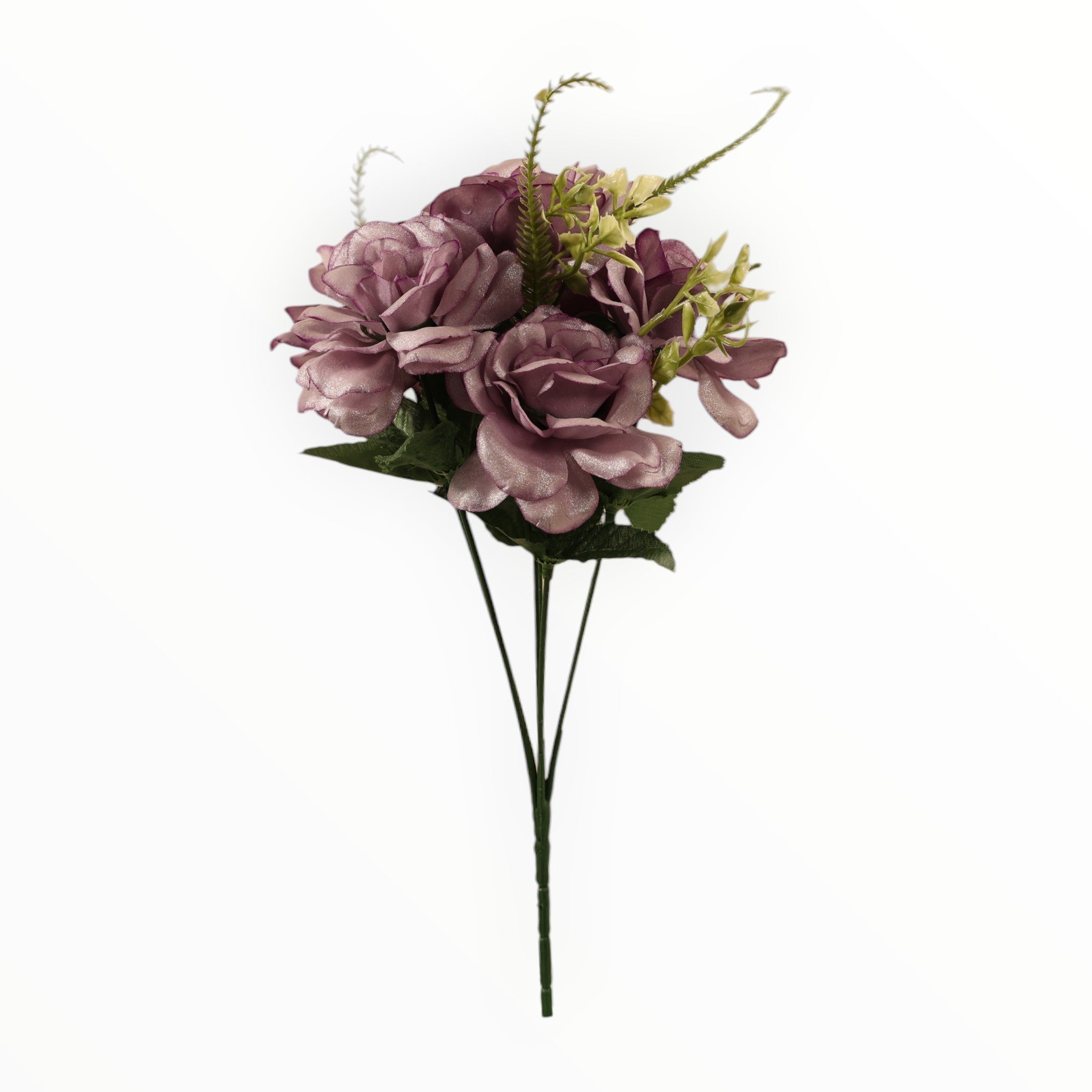 · Incluye delicadas ramas de helecho y hojas verdes con venas realistas que realzan la belleza de las flores.