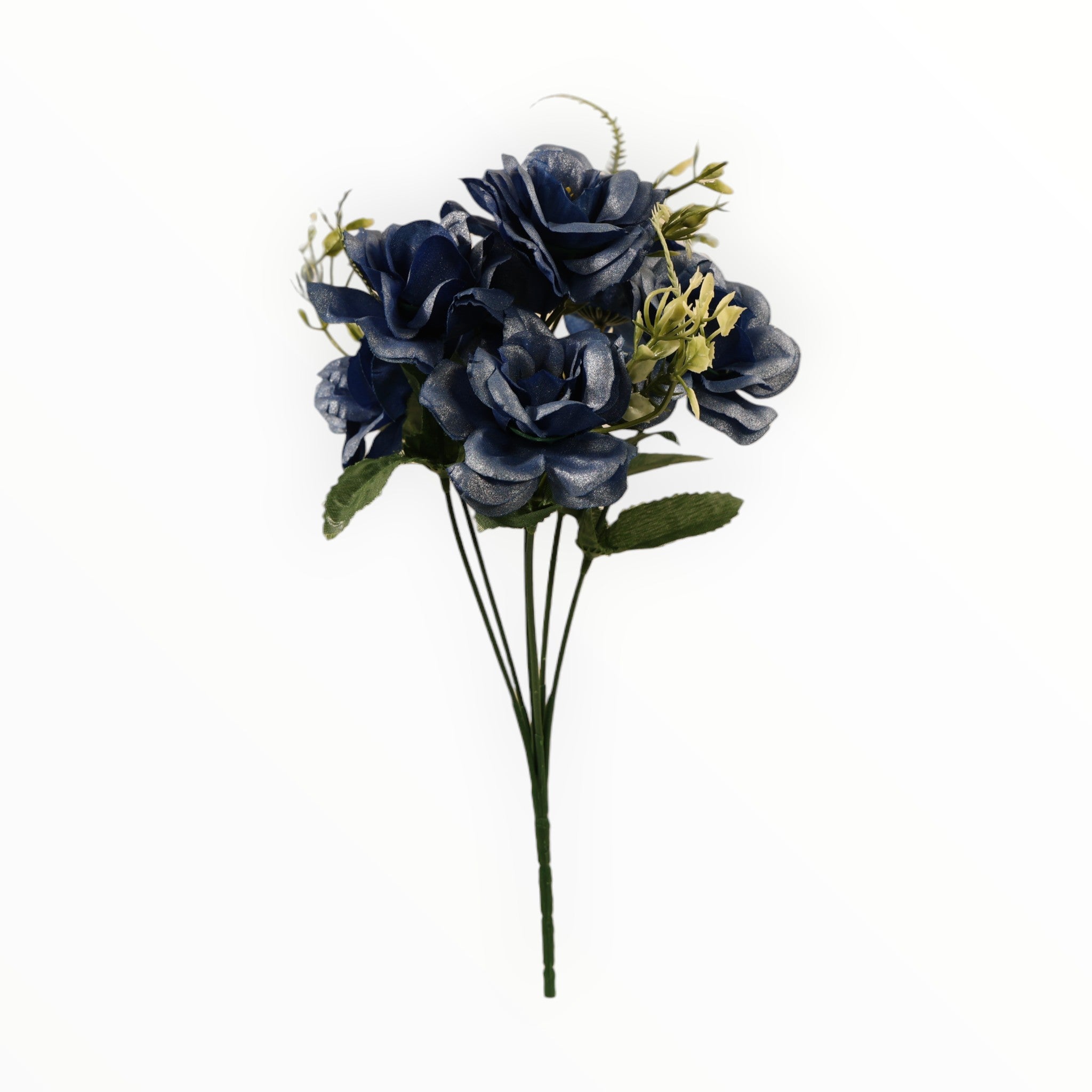 Añade un toque de brillo eterno a tus espacios. Este elegante ramo combina la delicadeza de las mini rosas con un acabado metálico único, complementado con follaje tipo helecho que aporta textura y un aspecto natural. Es la pieza ideal para quienes buscan una decoración moderna, duradera y sin mantenimiento.