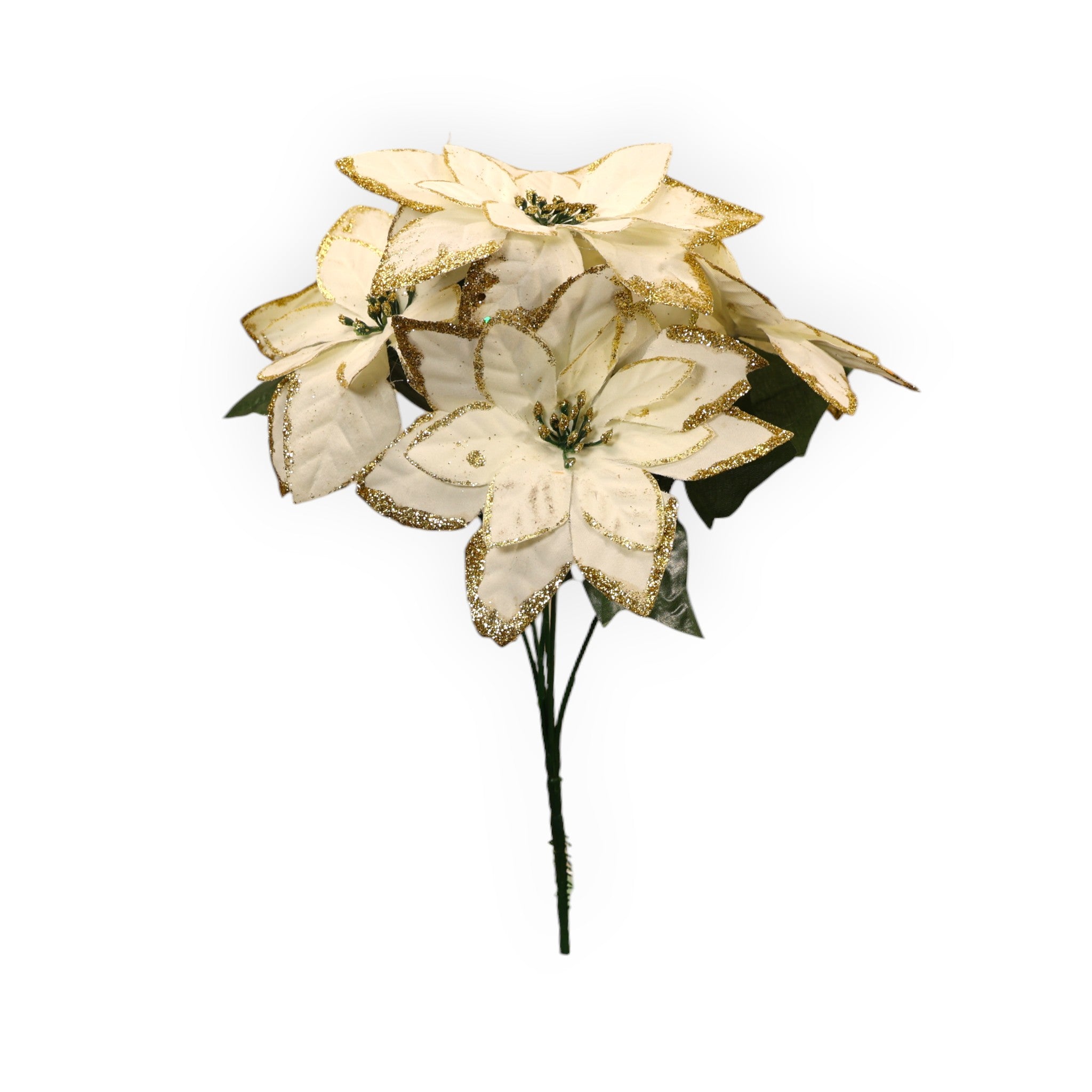 Ramo de seis nochebuenas decorativas con filo de diamantina que realza el contorno de cada pétalo. Su diseño detallado y... Leer más...