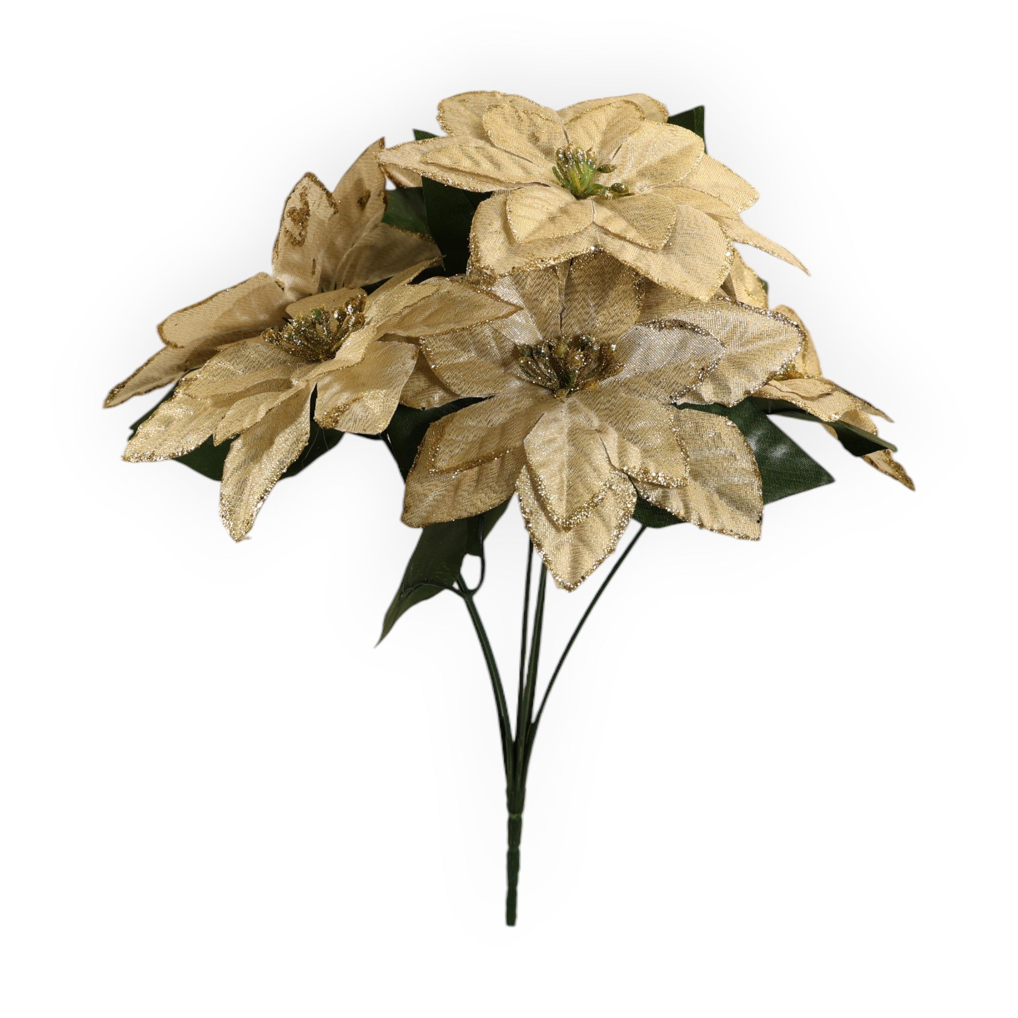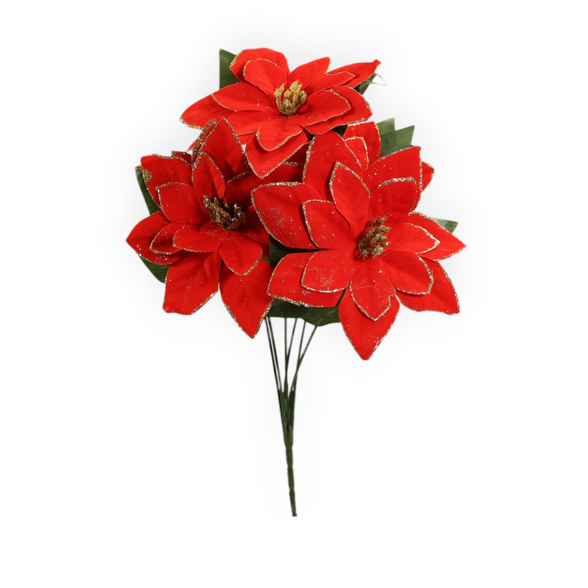 Ramo decorativo de seis nochebuenas con filo de diamantina que realza el contorno de cada pétalo. Su brillo sutil y... Leer más...
