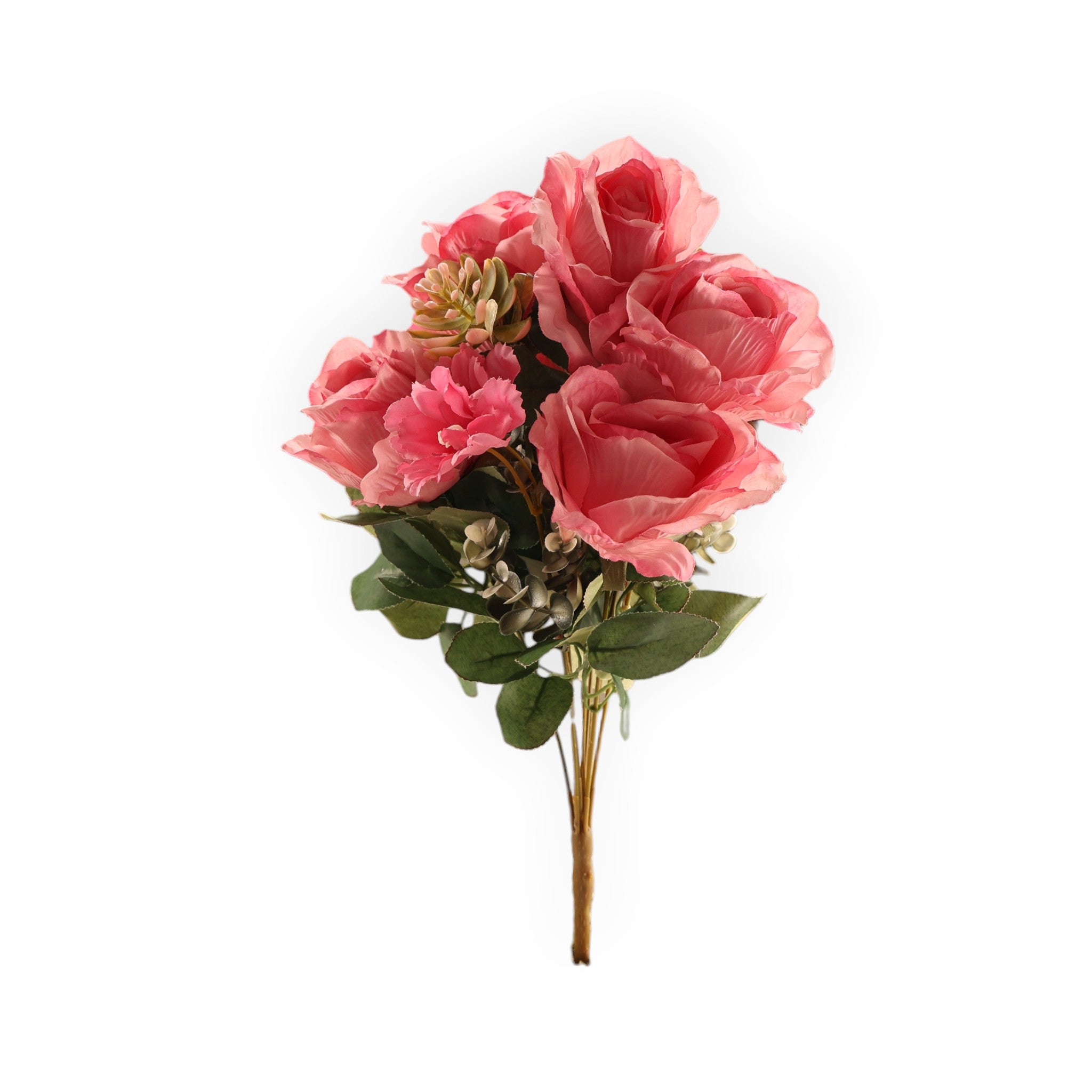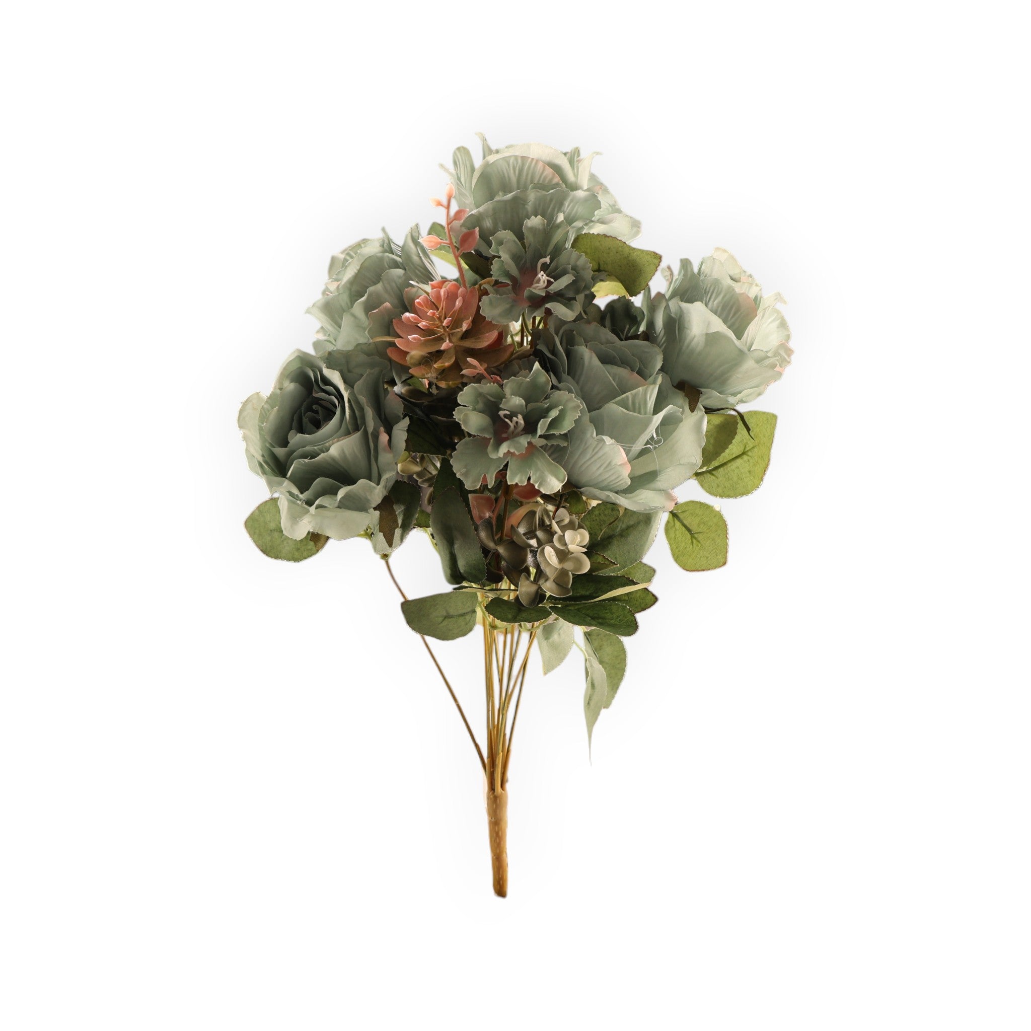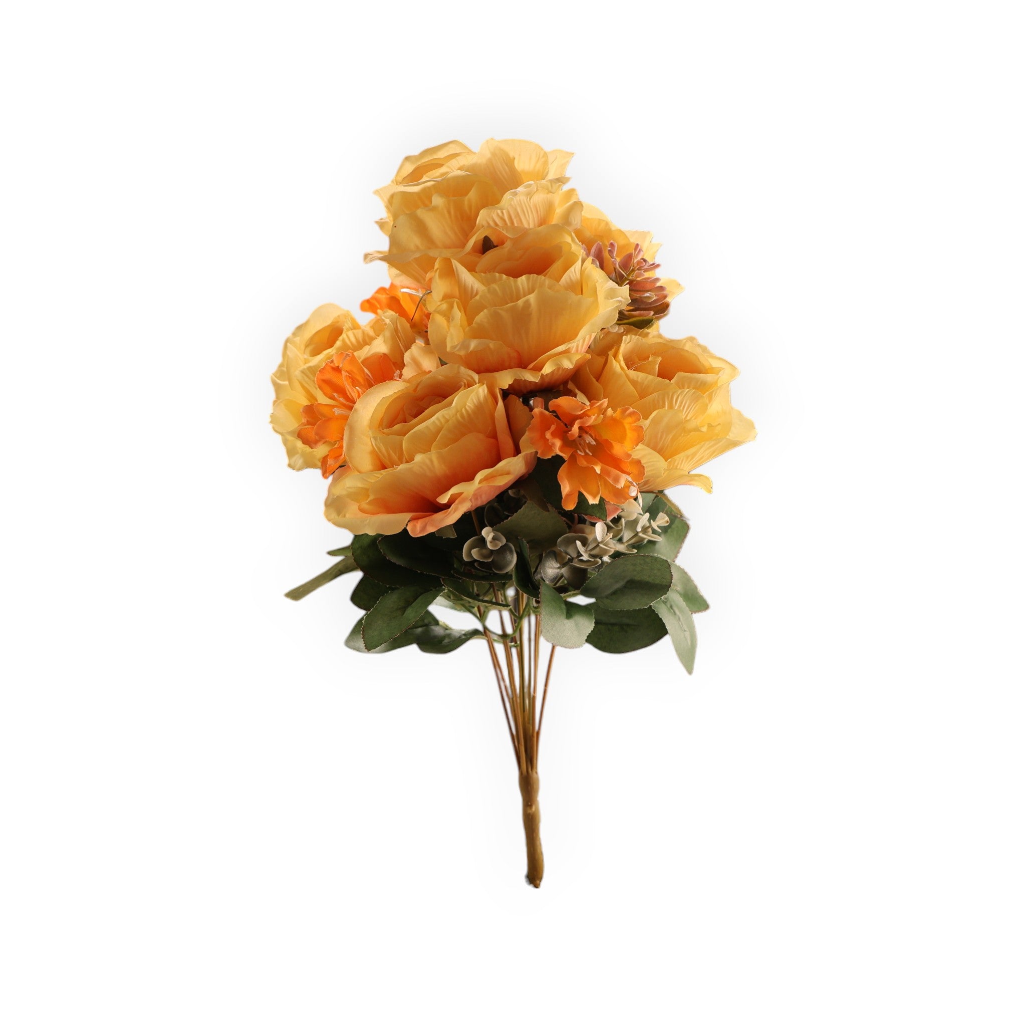 Ramo de once rosas artificiales acompañado de follajes decorativos que aportan cuerpo y equilibrio visual. Su diseño detallado lo hace... Leer más...
