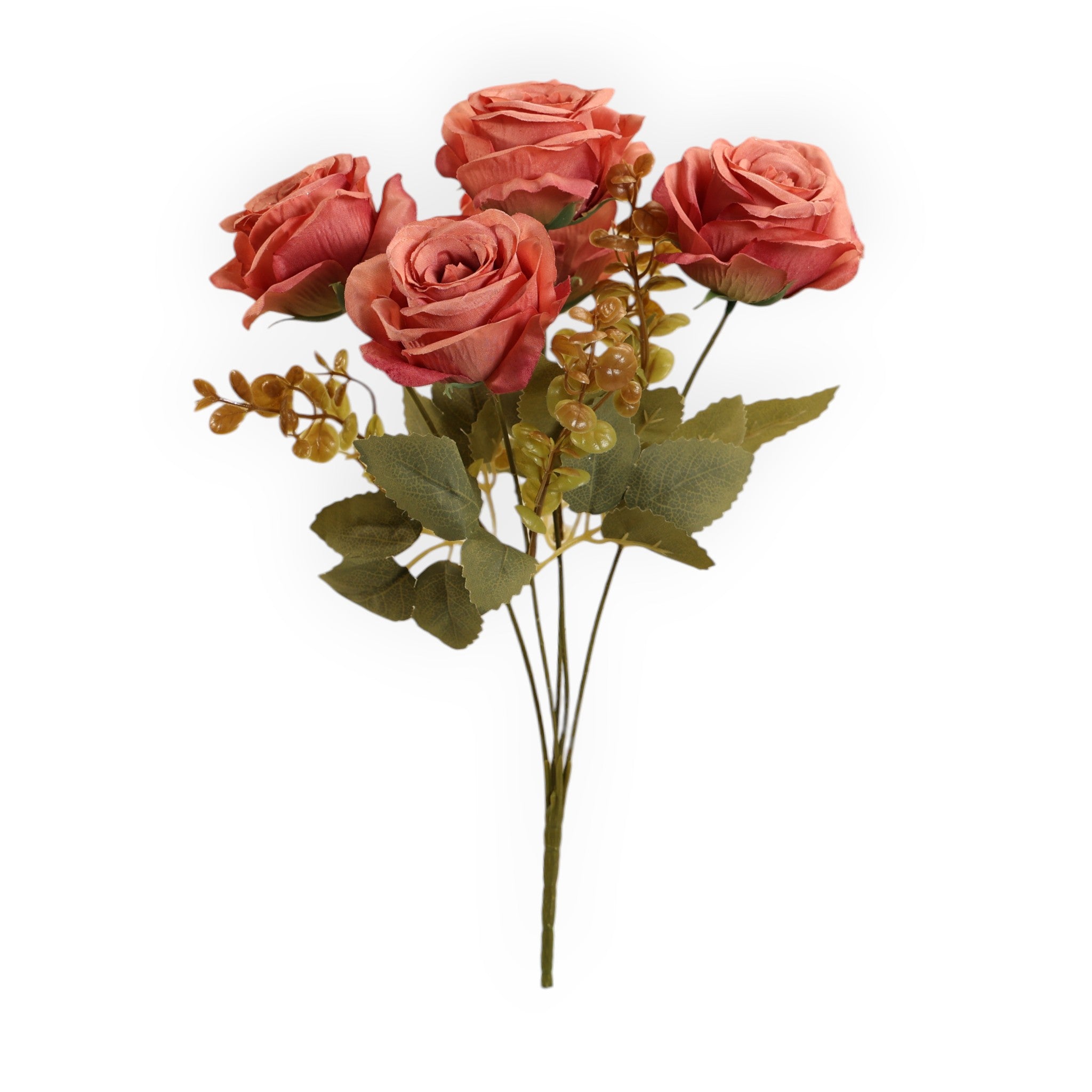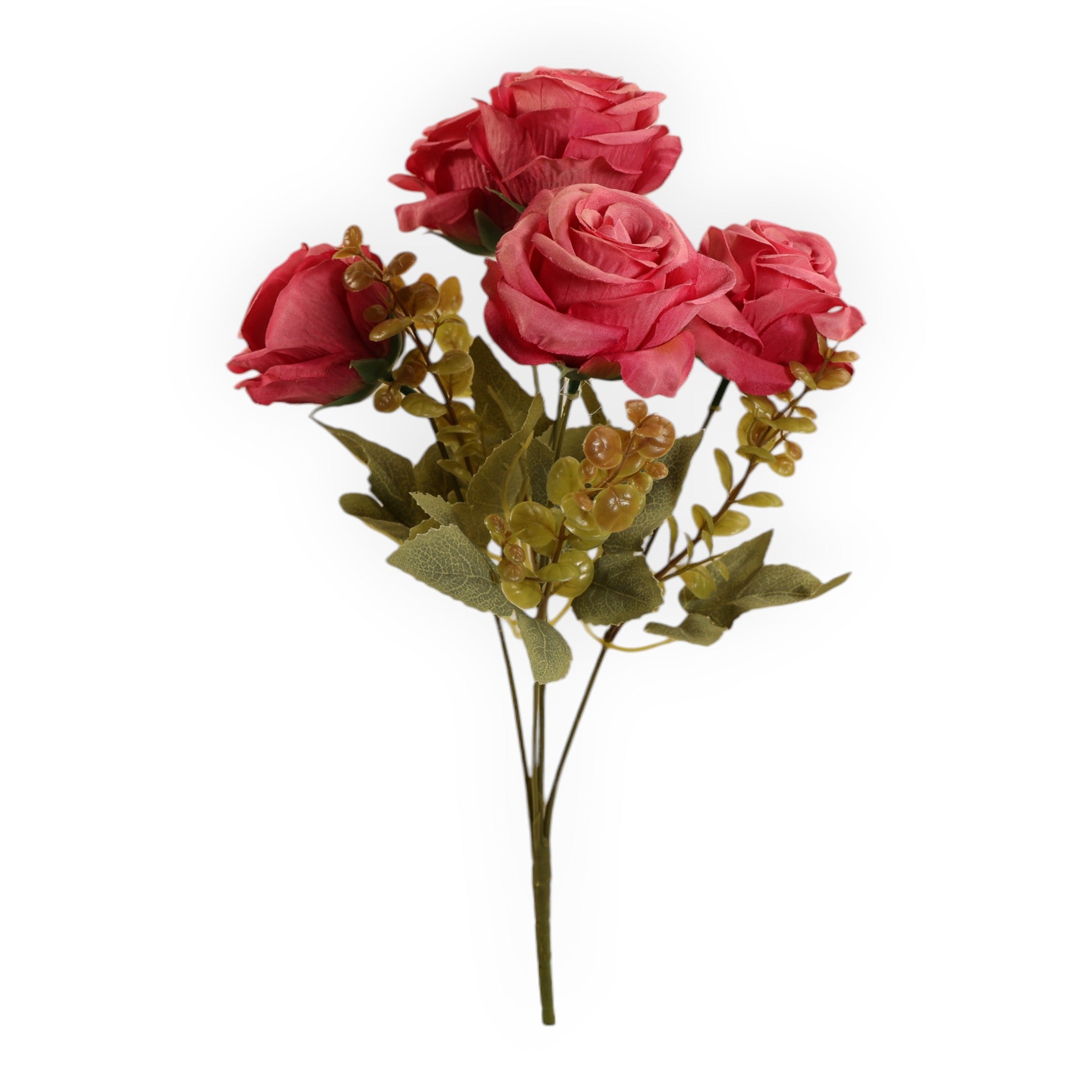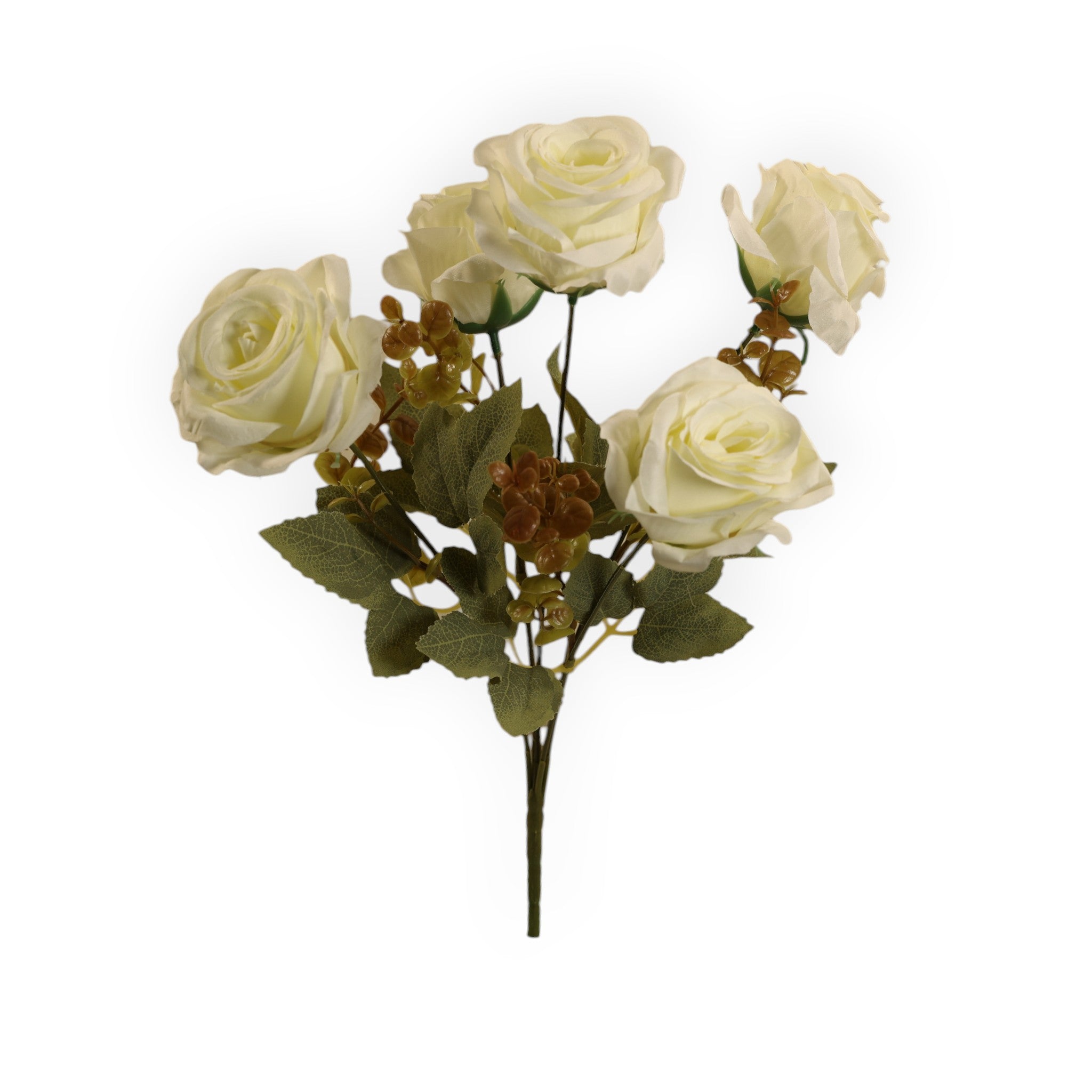Ramo decorativo compuesto por cinco rosas chicas artificiales acompañadas de follaje y detalles florales que realzan su volumen. Su diseño... Leer más...