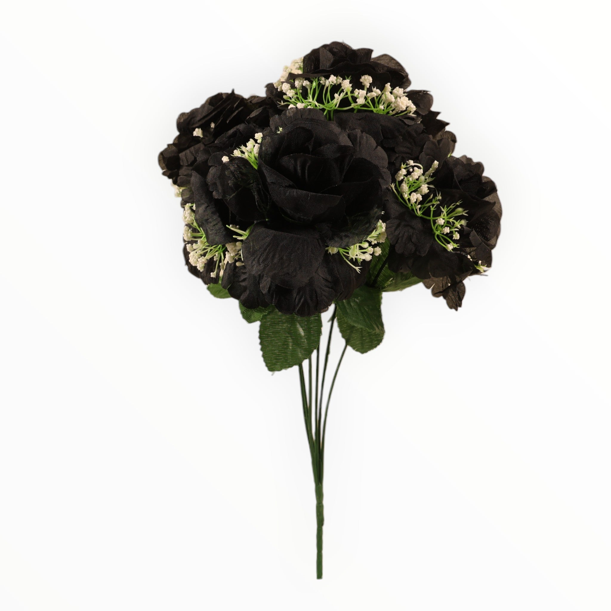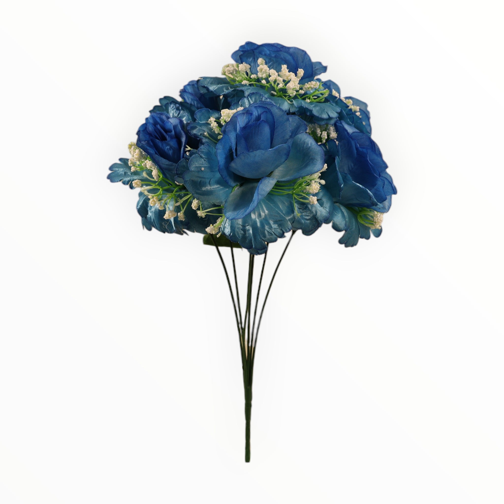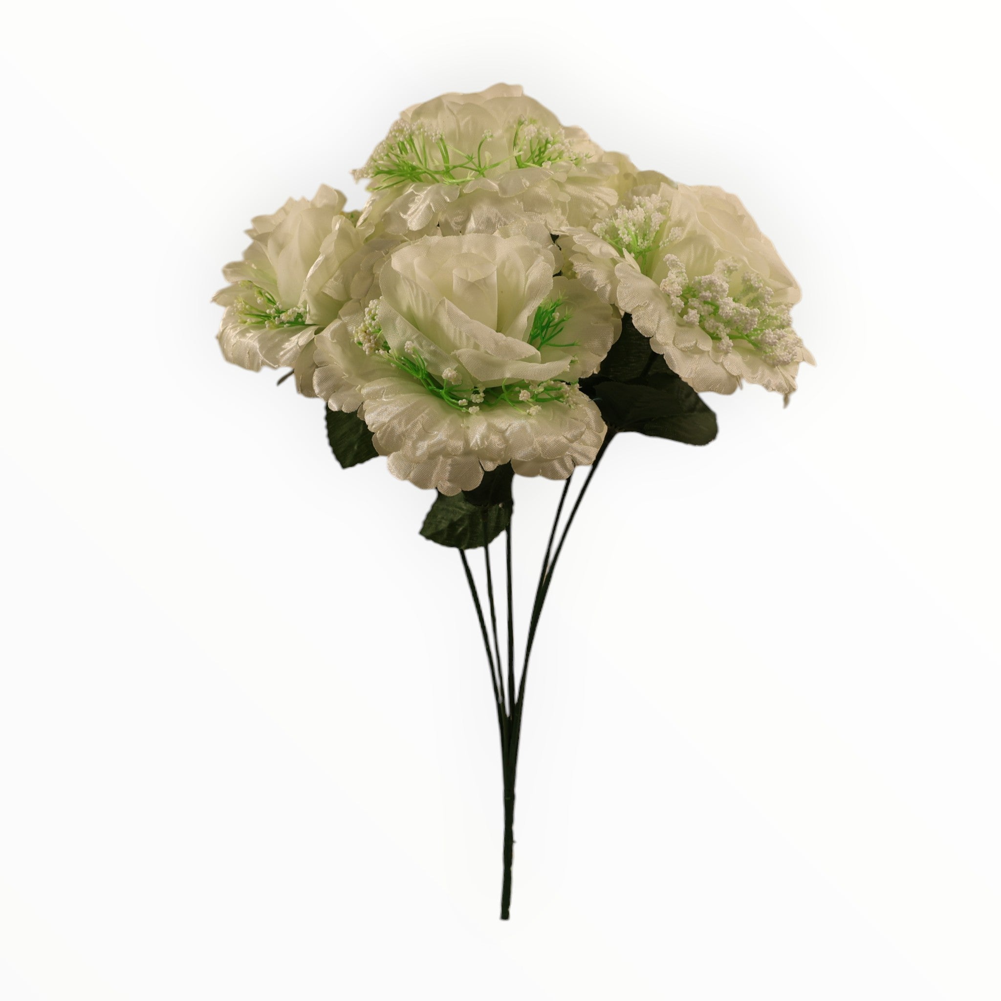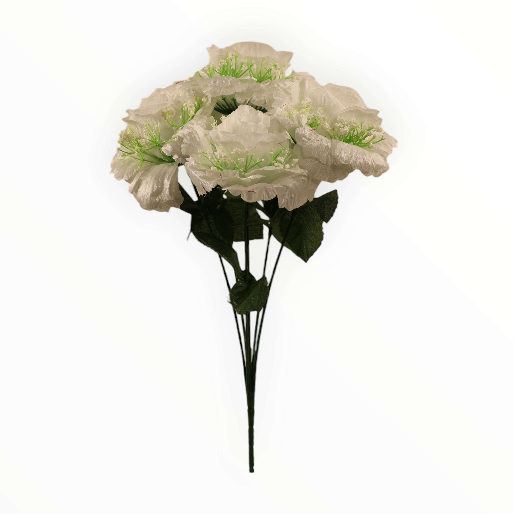 Añade un toque de calidez y sofisticación a cualquier espacio con nuestro exclusivo ramo de rosas abiertas. Confeccionadas en un suave satén de alta calidad, cada rosa presenta pétalos curvos que imitan la belleza natural de una flor en pleno esplendor. El diseño se complementa delicadamente con ramilletes de gypsophila (nube) blanca, creando un contraste visual encantador.